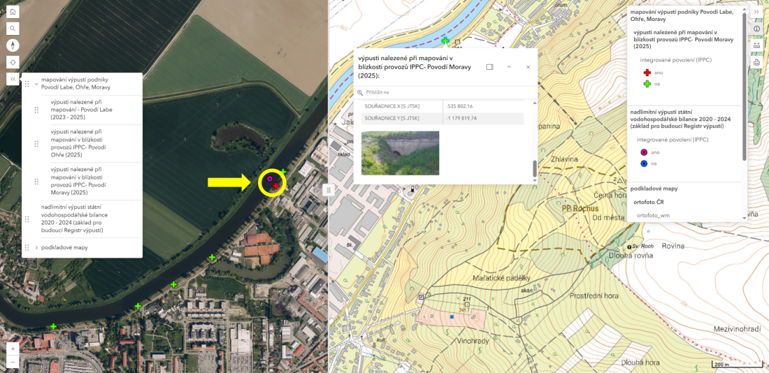 • V datech nadlimitních výpustí státní vodohospodářské bilance z let 2020 – 2024 a v datech zmapovaných výpustí jsou pochopitelně případy "duplicit", kdy data zmapovaných výpustí v některých případech "duplikují" data nadlimitních výpustí ze státní vodohospodářské bilance, ale liší se například polohou (viz například žlutě označený případ na obrázku výše). V rámci dalšího řešení projektu bude tedy nezbytné těchto více zdrojů "sjednotit" do jednoho datového zdroje bez duplicit (jednoznačně určit polohu výpustí, připojit fotografie tam, kde jsou k dispozici apod.).